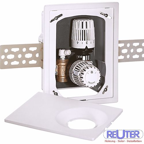Unterputz-Einbaubox Heimeier Multibox K-RTL,für die Einzelraumregelung und Rücklauftemperaturbegrenzung von Fußbodenheizungen.Heimeier Multibox K-RTL wird für die Rücklauftemperaturbegrenzung von Fußbodenheizungen, Wandheizungen oder kombinierten Fußboden-Radiatorheizungsanlagen eingesetzt.Die Raumtemperatureinstellung erfolgt mit dem integrierten Thermostatkof K,die Rücklauftemperaturbegrenzung mit dem ebenfalls integriertem RTL-Fühlerelement.Flexibler Ausgleich bei nicht lotrechtem Einbau bis 6° zu jeder Seite. Abdeckung mit verdeckter Schraubbefestigung, Ausführungen der Abdeckung in weiß RAL 9016.Flexible Montage für alle Wandarten, 30 mm Tiefenausgleich.